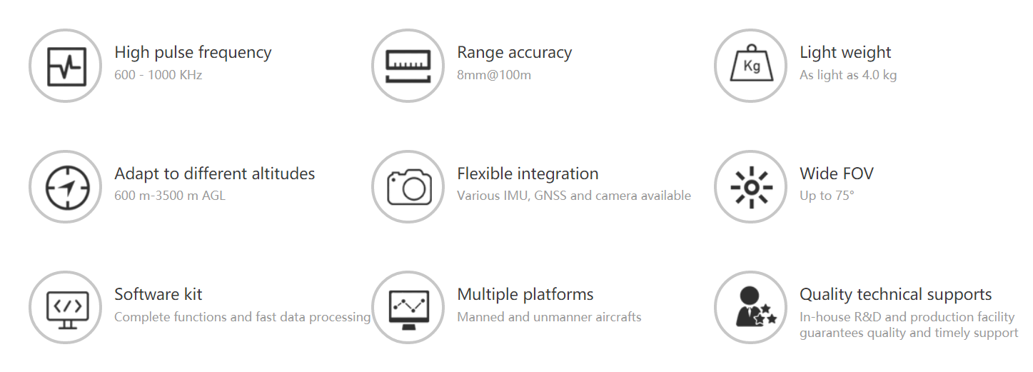 Compared with other products of the same type, the AP3500 LiDAR system has the characteristics of long-range, fast speed, high accuracy, flexible integration, and a wide range of platforms. The core parameters can meet 1: 500, 1: 1000 and 1: 2000 conventional scales requirements for surveying;